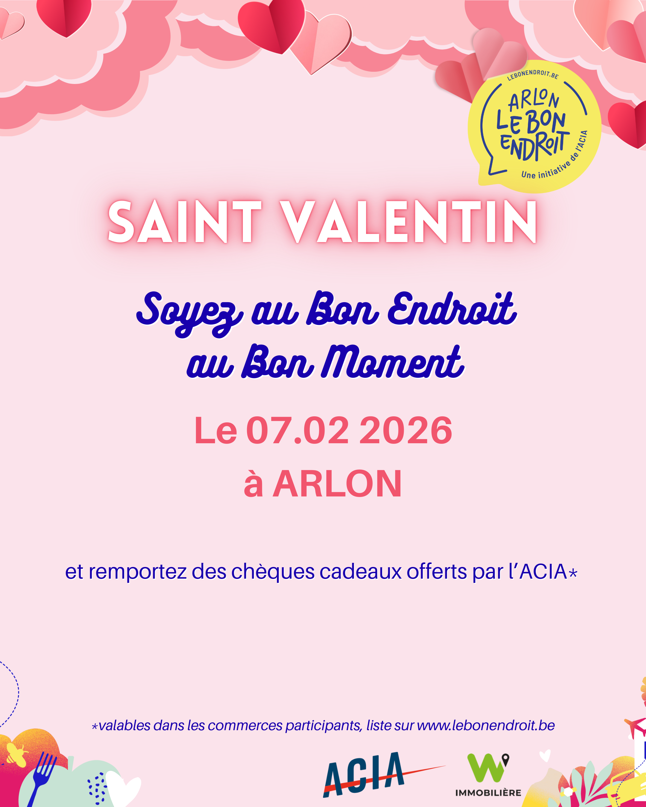 🩷 Le samedi 7 février, soyez au Bon Endroit, au Bon Moment, chez l'un de nos commerçants arlonais. Vous remporterez peut-être un chèque de 50€ pour faire un très beau cadeau à votre Valentin ou votre Valentine 🎁